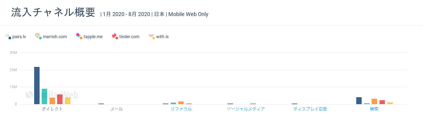 xブランド認知、あるいは事前にどのアプリを使うかを調べた上でユーザーが各サイトに来ている為、マッチングサイトの主な流入はダイレクト訪問であると言えます。広告からの流入に力を入れているサイトは少なく、広告を展開しているPairsやMarrishでも各チャネルのトラフィックシェアは1%未満となっています。x