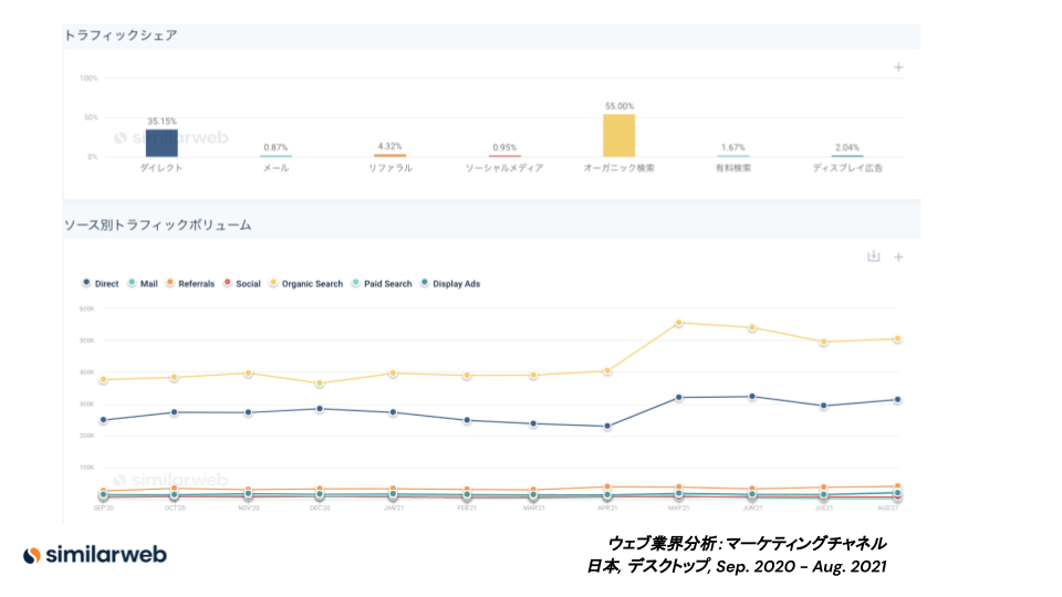 マーケットの成長性と合わせて、マーケティングチャネル別のトラフィックを確認しておきます。この業界における主要なサイトのトラフィックがどのチャネルに依存しているのかを理解すると同時に、今後の集客施策を考える際に参考になる情報を入手することが目的です。