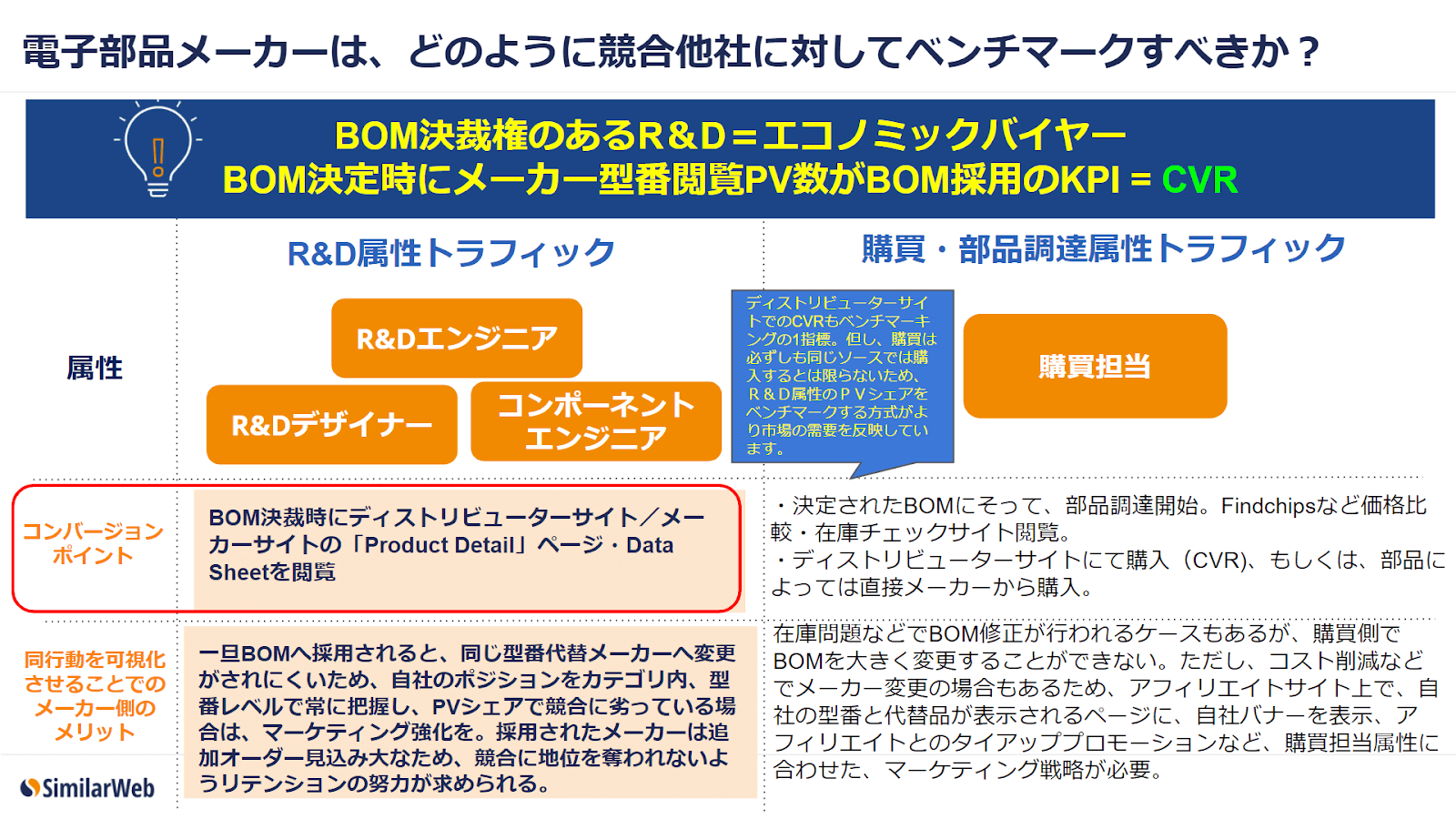 半導体業界における部品購買ファネルは、B2Cと異なり、独自の購入サイクルがあります。一般的に、使用したい部品をの選択権限者(エコノミックバイヤー)は、BOM(Bill of materials = 部品表)作成の工程を管轄するR&D /エンジニアリングにあります。各部品が、公式BOMの一部として決定されると、その後、BOM(Bill of Material=部品表)上にある部品の調達を担当する購買部署へアサインをされると、最終的にコンバートされる(商品として購入される)確率が高くなります。