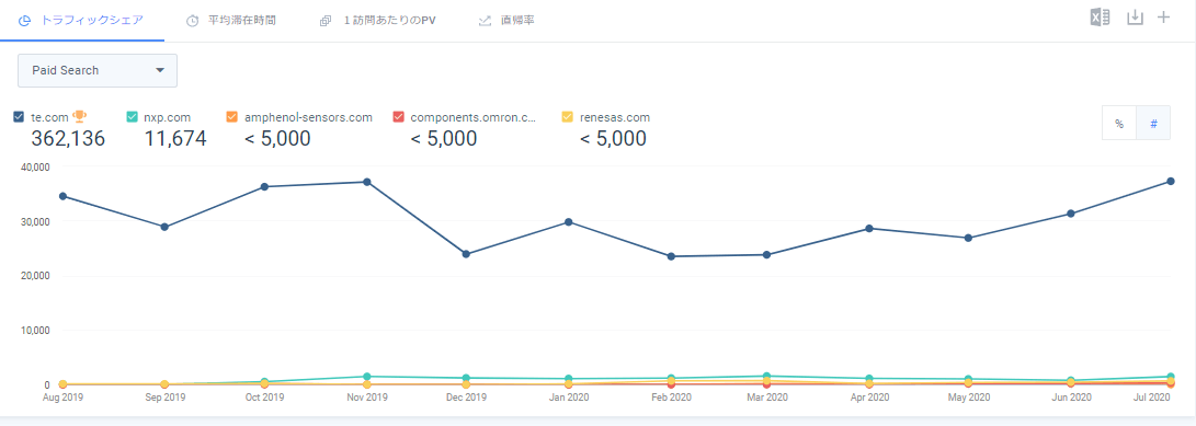 画像2(円グラフ)は、シミラーウェブのウェブ分析を使って、グローバルに販売を展開している大手認定ディストリビューター5社(digikey.com、mouser.com、arrow.com、avnet.com、farnell.com)のトラフィックとエンゲージメントデータです。データフィルタは、過去12か月(2019年8月から2020年7月)で、全世界からのデスクトップ、及び、モバイルウェブプラットフォームからのトラフィックを基に測定されています。