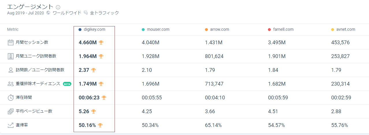 画像2の円グラフにありますとおり、トラフィックの点では、digikey.com、mouser.com、 farnell.comの3サイトで、トラフィックの87%をカバーしており、同業界における流通面において重要な存在であることが反映されていると言えます。尚、画像3では、トラフィックだけでなく、各サイト内でのPV数や滞在時間、直帰率の面で比較をすると、digikey.comのパフォーマンスの高さが目立ちます。