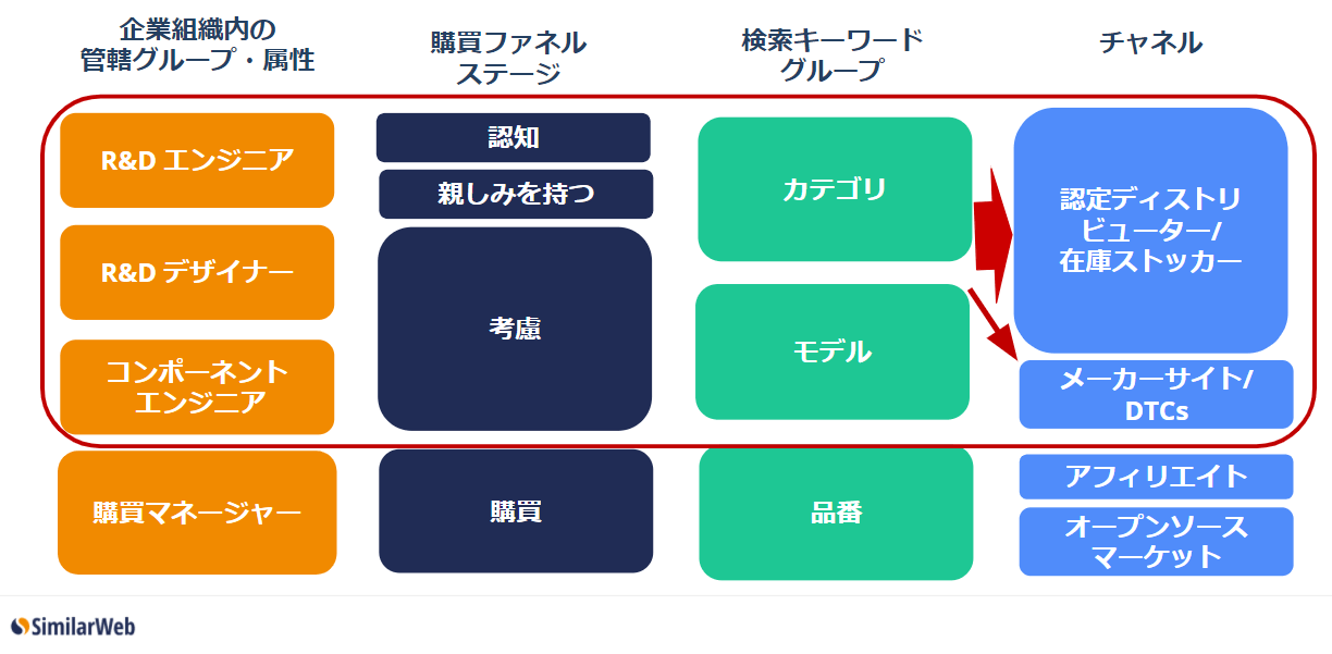 ここからは、digikey.comサイトを対象に、訪問している属性に関して検証してみたいと思います。同サイトの訪問者の属性を調べるあたり、シミラーウェブの「サイト内フレーズ分析」を活用しました。今回の分析では、2019年8月~2020年7月に米国内でdigikey.comにデスクトップから訪問している訪問者によって、同サイト内の検索ボックスを使って検索されたキーワードの内、上位600件のキーワードをタイプ別に分類を行っています。分類を行う前提としては、最終的な部品のメーカーや品番が決定されていない段階で、BOMを作成するR&D属性は、特定の品番ではなく、部品のカテゴリ名が検索されるであろう、という点です。品番を検索キーワードに入れる属性は、特定のメーカーの商品を探している段階にあるため、R&Dではなく、むしろ調達を行う購買担当者と推定されます。(以下の画像4にて、同過程を図式化)