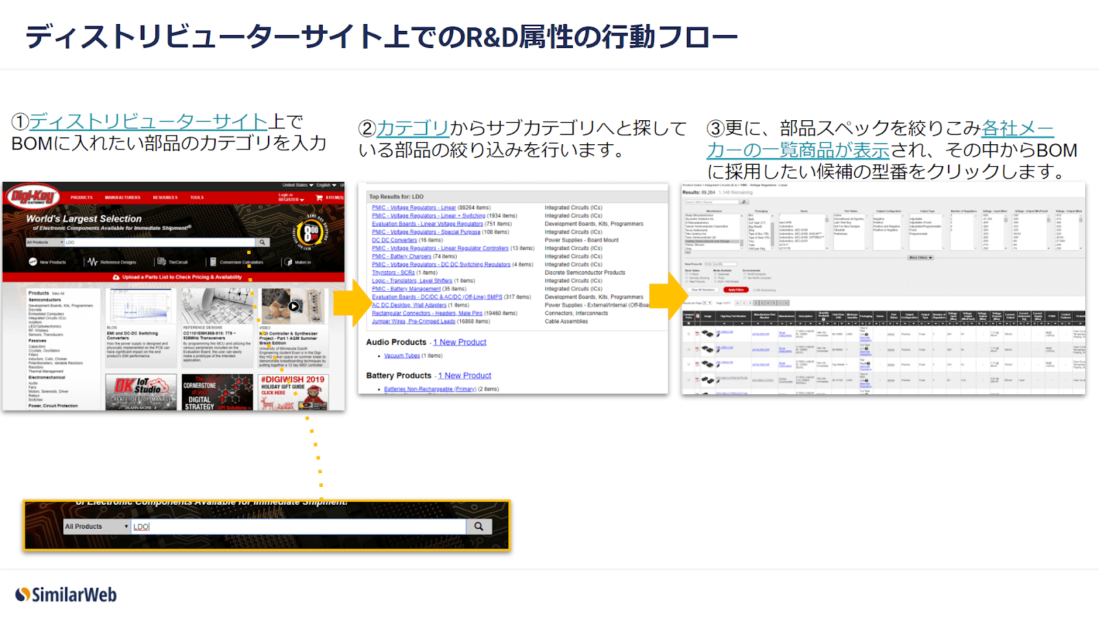 ここからは、具体的に、どのように対象サイトとなるdigikey.comで分析を行うか、ご紹介します。通常、対象サイトが定まると、オーディエンスが取る行動を基に分析方法を設定します。ここでは、シミラーウェブの「Top Product Report(トッププロダクトレポート)」もしくは、「Retail Analytics(リテール・アナリティクス)」という機能で、カテゴリレベル・品番レベルのパフォーマンス分析をベースとするインサイトをご紹介しています。