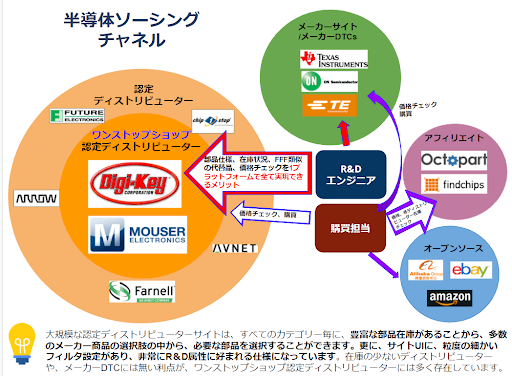 以下は、米国の半導体調達チャネルを表す図です。前回のブログでは、半導体業界の分析に、デジタルデータがどのように活用できるかを説明しましたが、同ブログにて強調したい部分は、以下、画像7の半導体ソーシングチャンネル図中央の赤い矢印部分、R&Dエンジニア属性が、「ワンストップショップ」の認定ディストリビューターサイトへ訪問し、閲覧している部品のページビューから、需要トレンドを分析する、ということです。