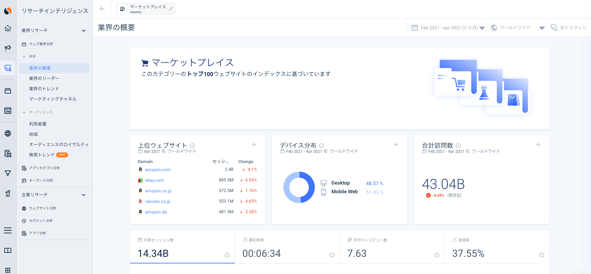 新規市場への参入や、新製品ローンチ前の調査などにも、シミラーウェブのリサーチソリューションが活用できます。