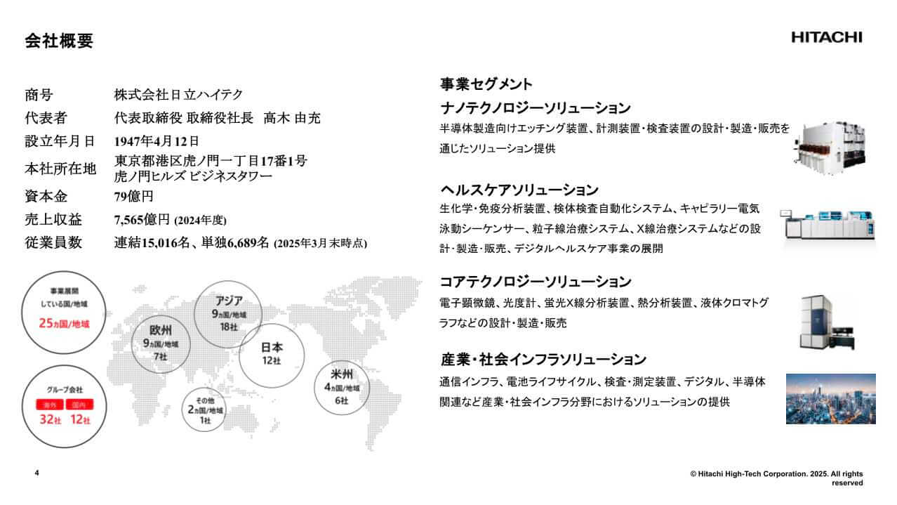 株式会社日立ハイテクは1947年4月に設立され、2024年度の売上収益は7,565億円。25カ国・地域にビジネスを展開するグローバル企業です。