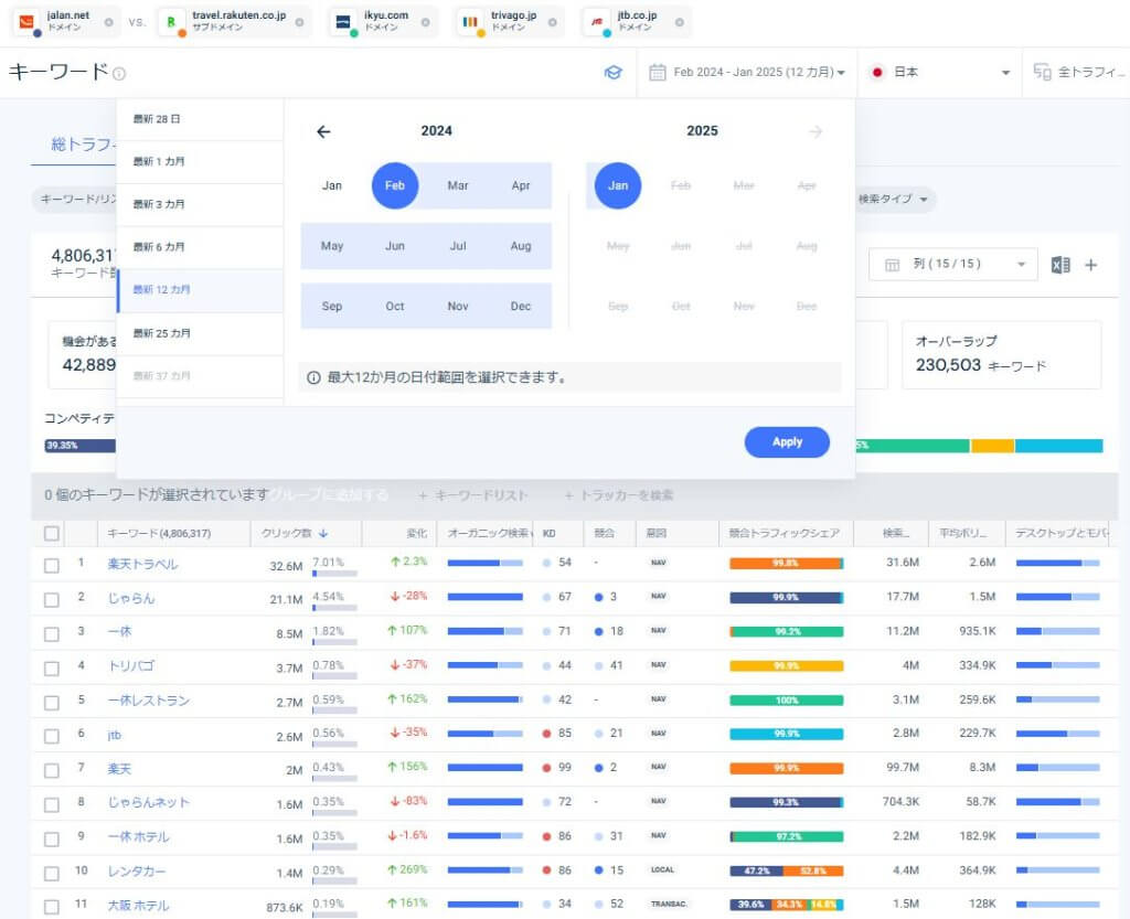 キーワードページの日付選択機能を更新し、最長12ヶ月のフレキシブルな期間をサポートするようになりました。