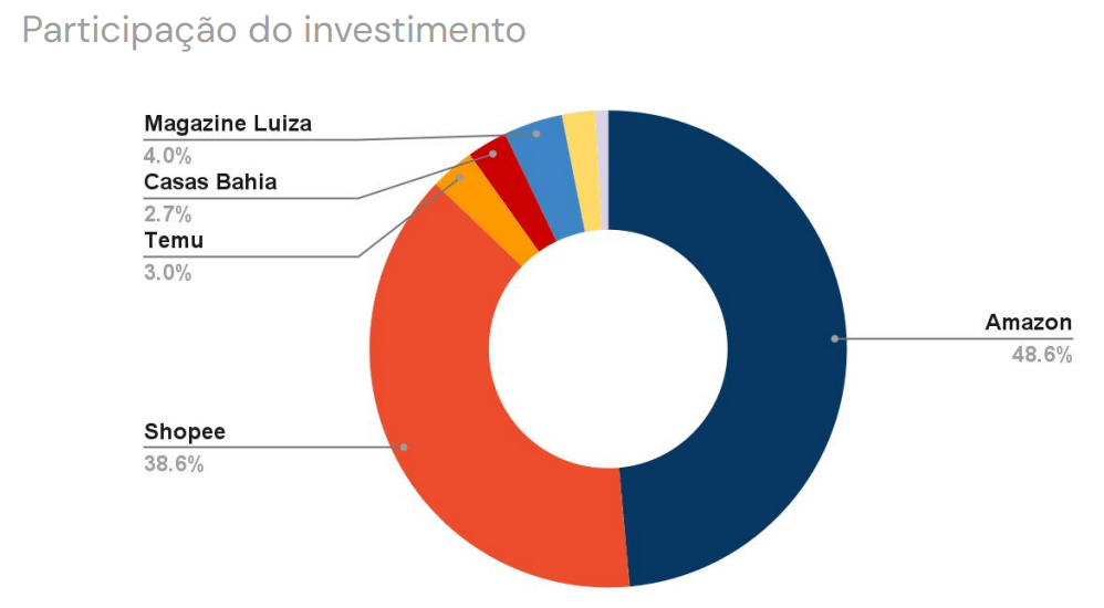 Os investimentos dos marketplaces apresentaram uma trajetória de crescimento a partir da primeira semana de julho, totalizando US$ 8.2 milhões. Amazon e Shopee lideraram os aportes no período, sendo as marcas que mais investiram em mídia.