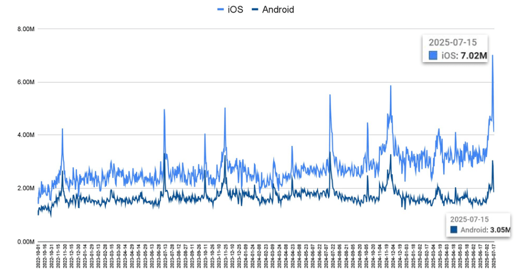 - +119,5% de usuários ativos no iOS, totalizando 7 milhões de usuários ativos no 15/07.