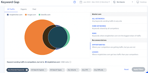 O segundo recurso que queremos destacar é o keyword gap tool (recurso de oportunidades de palavra-chave) porque a ferramenta inclui um filtro de busca de vídeos. Aqui você encontra palavras-chave que geram tráfego para o website de seus competidores, mas não para o seu. Com esse recurso fica fácil descobrir o que você está perdendo.