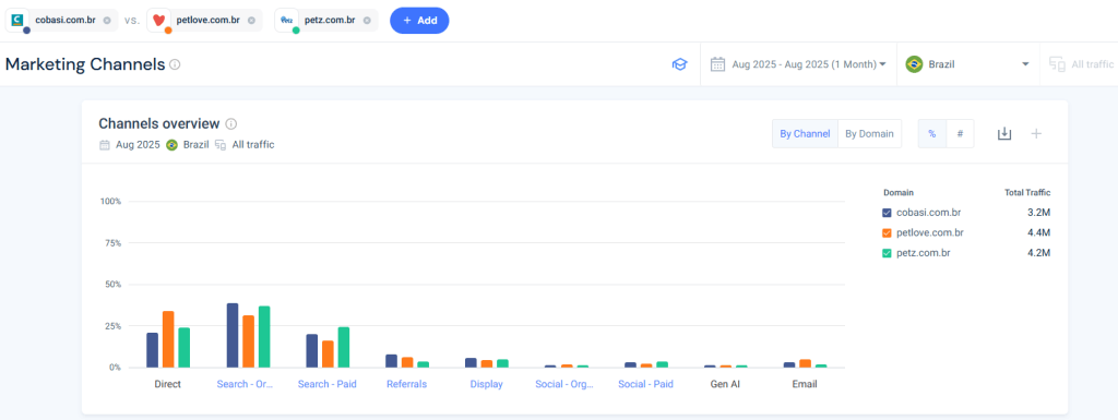 Visualização dos canais de marketing de players do setor Pet no Brasil no mês de agosto de 2025.