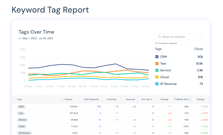 - Monitore palavras-chave por grupos, tags e volumes de busca.
