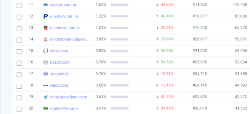 Além disso, dentro da ferramenta de análise competitiva da Similarweb, é possível verificar que grande parte da audiência dos 5 domínios com maior volume de tráfego no setor automotivo, e que pertencem à categoria de manutenção, chega através do tráfego direto (ou seja, digitando a URL exata na barra de pesquisa) e por buscas orgânicas (quando o público pesquisa pelo nome da empresa na barra de pesquisa). Isso representa um grande amadurecimento da categoria de manutenção, pois demonstra que o público está realmente interessado, buscando por serviços e produtos sem necessidade de anúncios pagos.