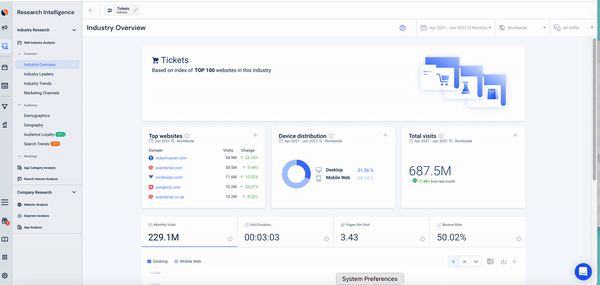 Вы можете отфильтровать весь трафик, данные веб-сайтов с компьютеров и мобильных устройств, чтобы увидеть лидирующие компании для каждой из платформ.