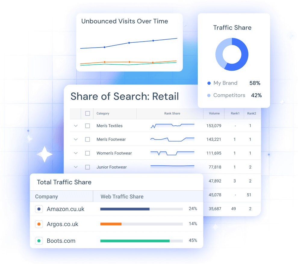 You’ll get access to market-level insights like search volume trends, site engagement, audience behavior, brand health metrics, retailer performance, sentiment tracking, and more, all benchmarked against competitors.