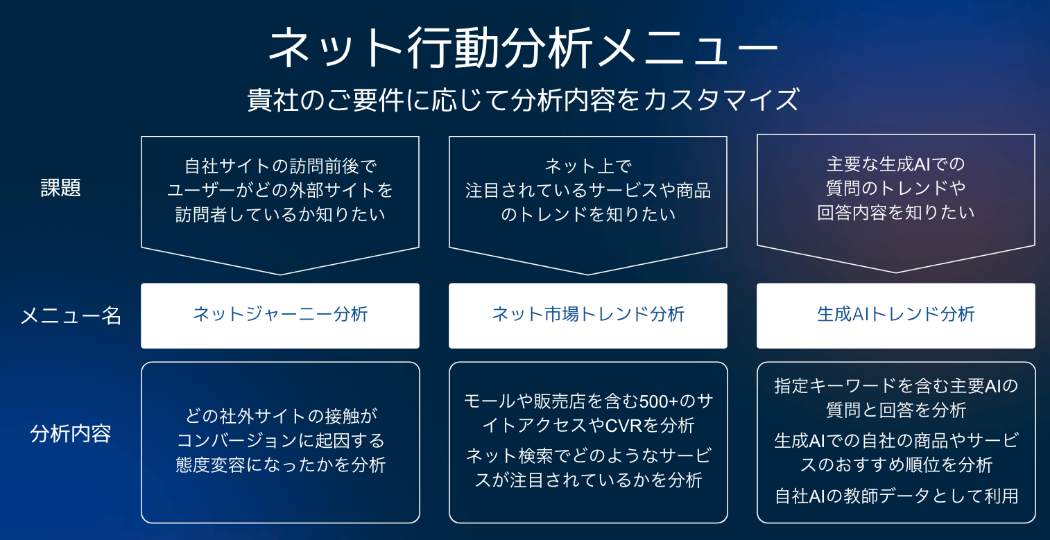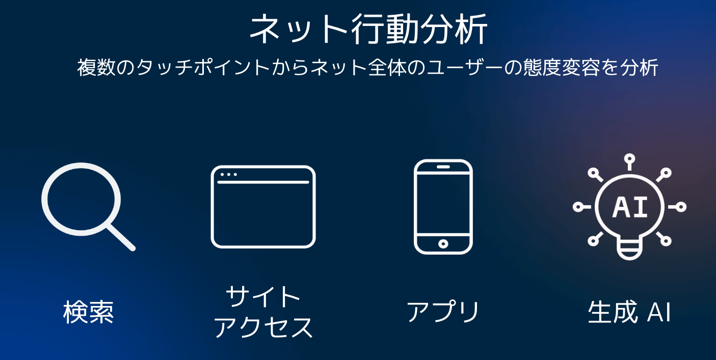 「ネット行動分析」はネット上でのユーザーの態度変容を可視化するサービスです。グローバル最大手の検索企業やモール運営企業、さらにAIを活用したコンテンツ配信アルゴリズムで知られる中国のテクノロジー企業などで、すでに導入実績があります。