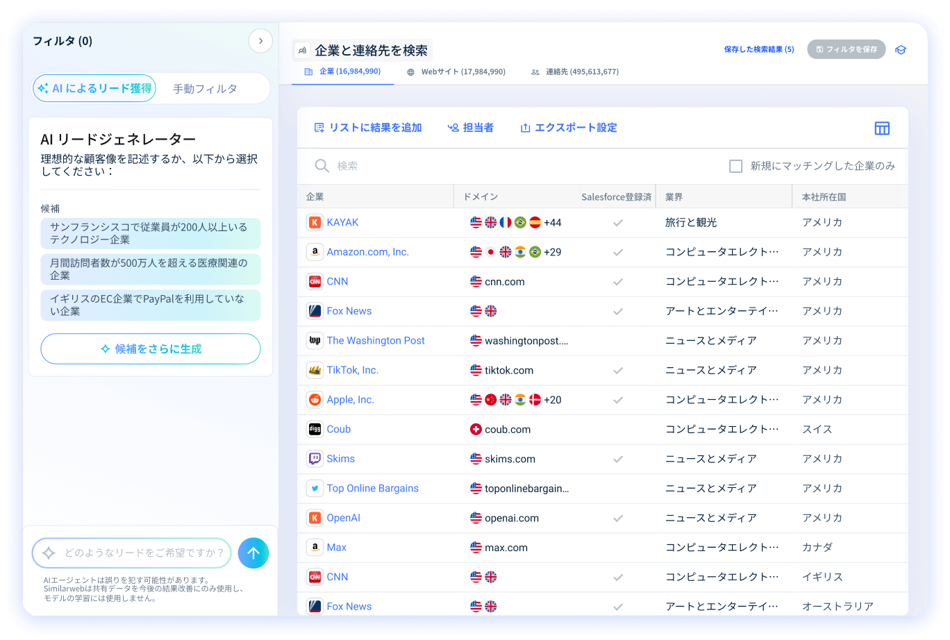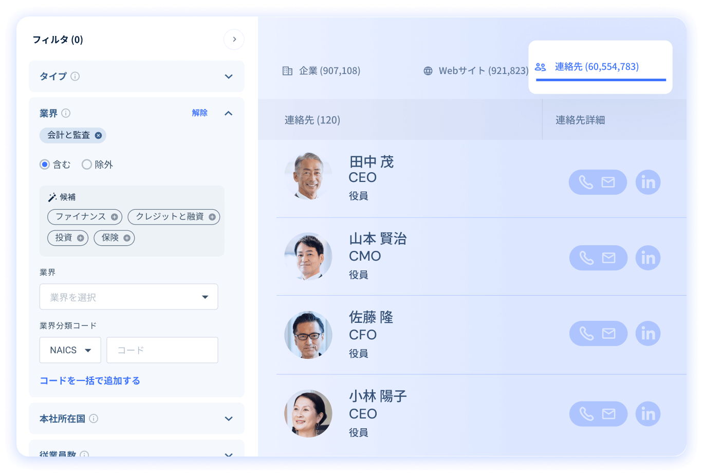 2,040万社以上の企業情報と、3億7,000万件を超える連絡先データを網羅。 100以上の詳細な条件で、営業に最適なリードを抽出できるリードジェネレーション ツールをご提供。