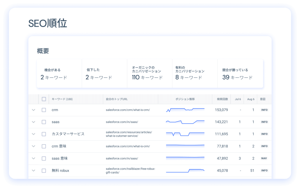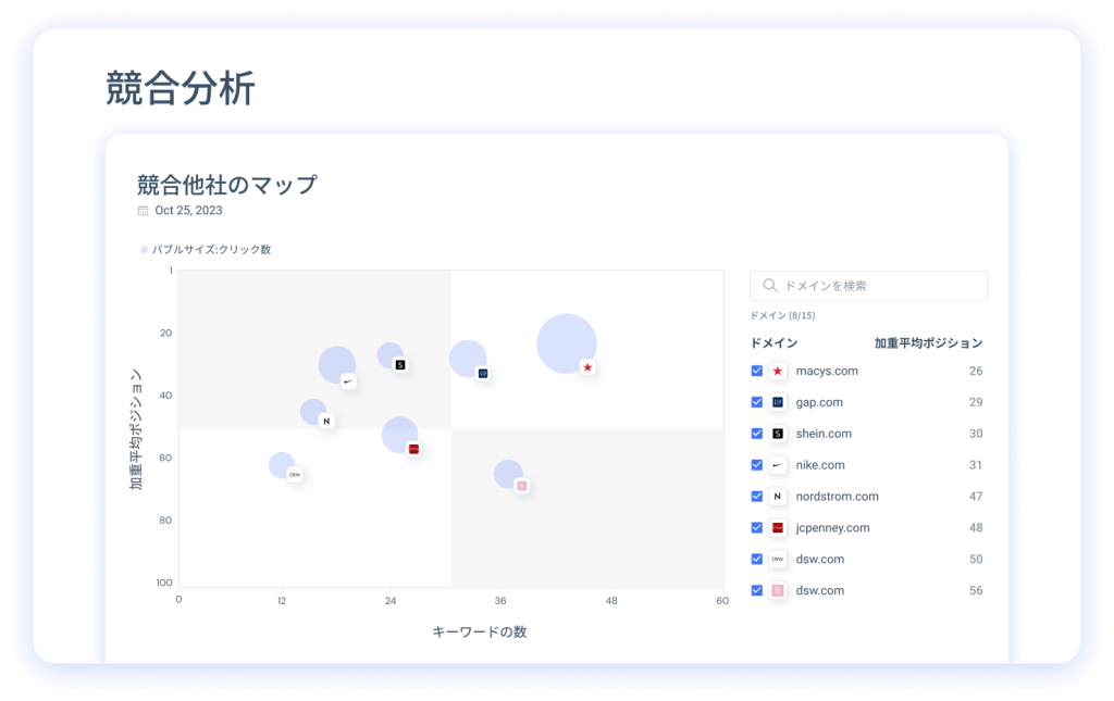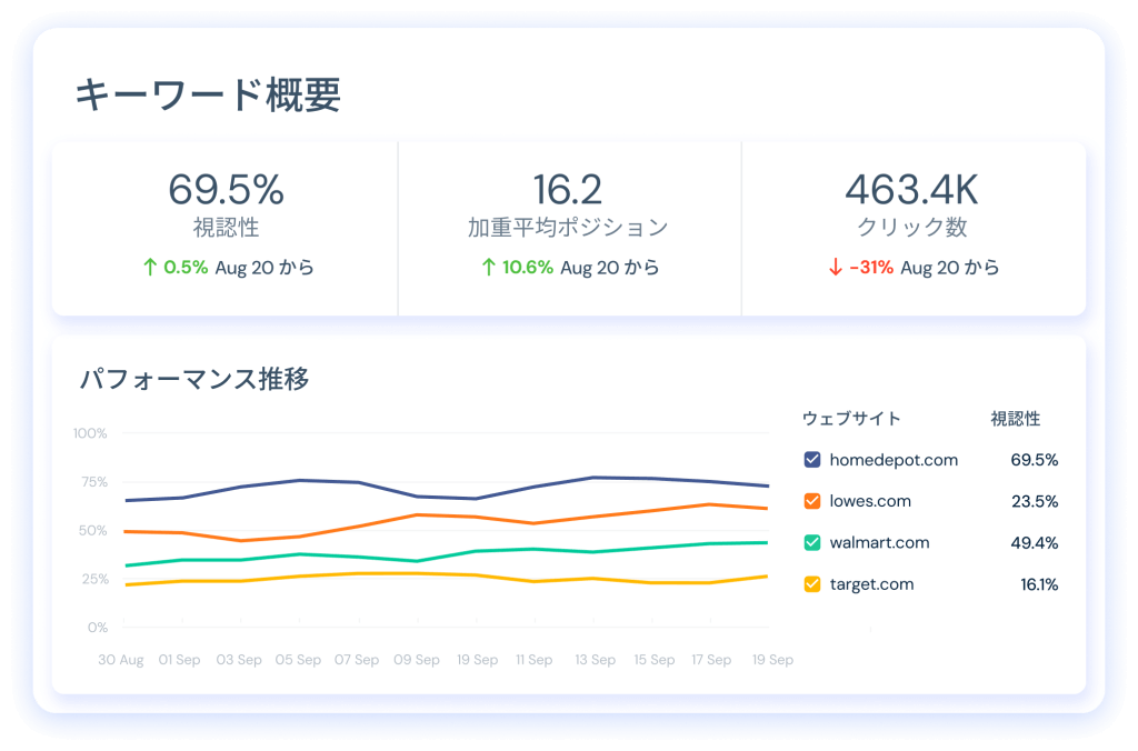 自社と競合他社のSEOにおけるパフォーマンスを監視し、より高いキーワード順位獲得のための戦略立てに活かせます。