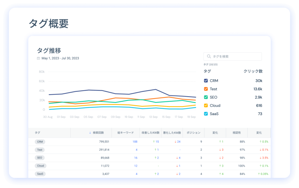 モバイルやパソコンごとに、国単位から都市や郵便番号単位まで、SEOでの成功に重要なキーワードの順位を確認できます。各キーワードやウェブページ、タググループごとのクリック数データを毎日更新で取得できるため、順位が実際の集客につながっているかを非常に高い精度で分析できます。