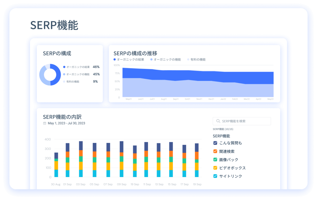 地域系キーワードのSEO順位を追跡することにより、狙ったエリアワードの検索順位の上昇に注力できます。190か国に対応し、検索結果の構成や地域ごとの特徴を表示。最新データと競合の順位状況を把握し、地域系SEOを成功に導きましょう。