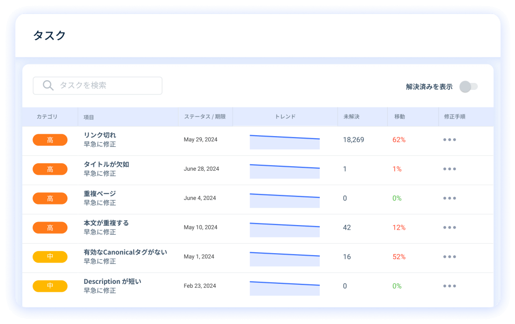 最適なタイミングで、スケジュール通りにクロール(サイト分析)を実行します。推奨されるすべての最適化は、修正手順、影響度合い、優先順位に基づいて確認できるため、次のタスク・アクションプランを簡単に作成できます。