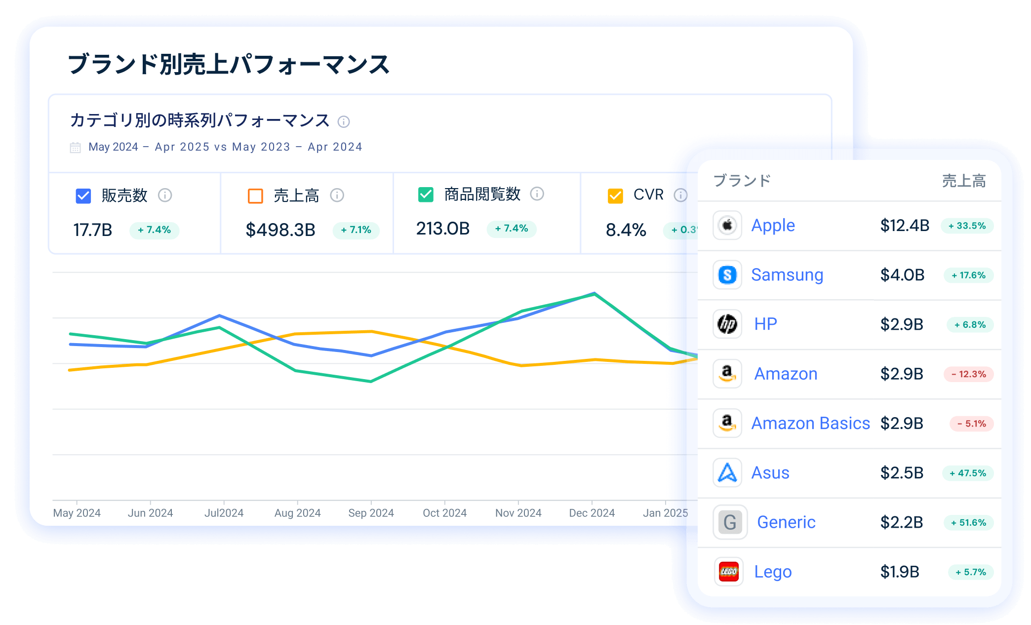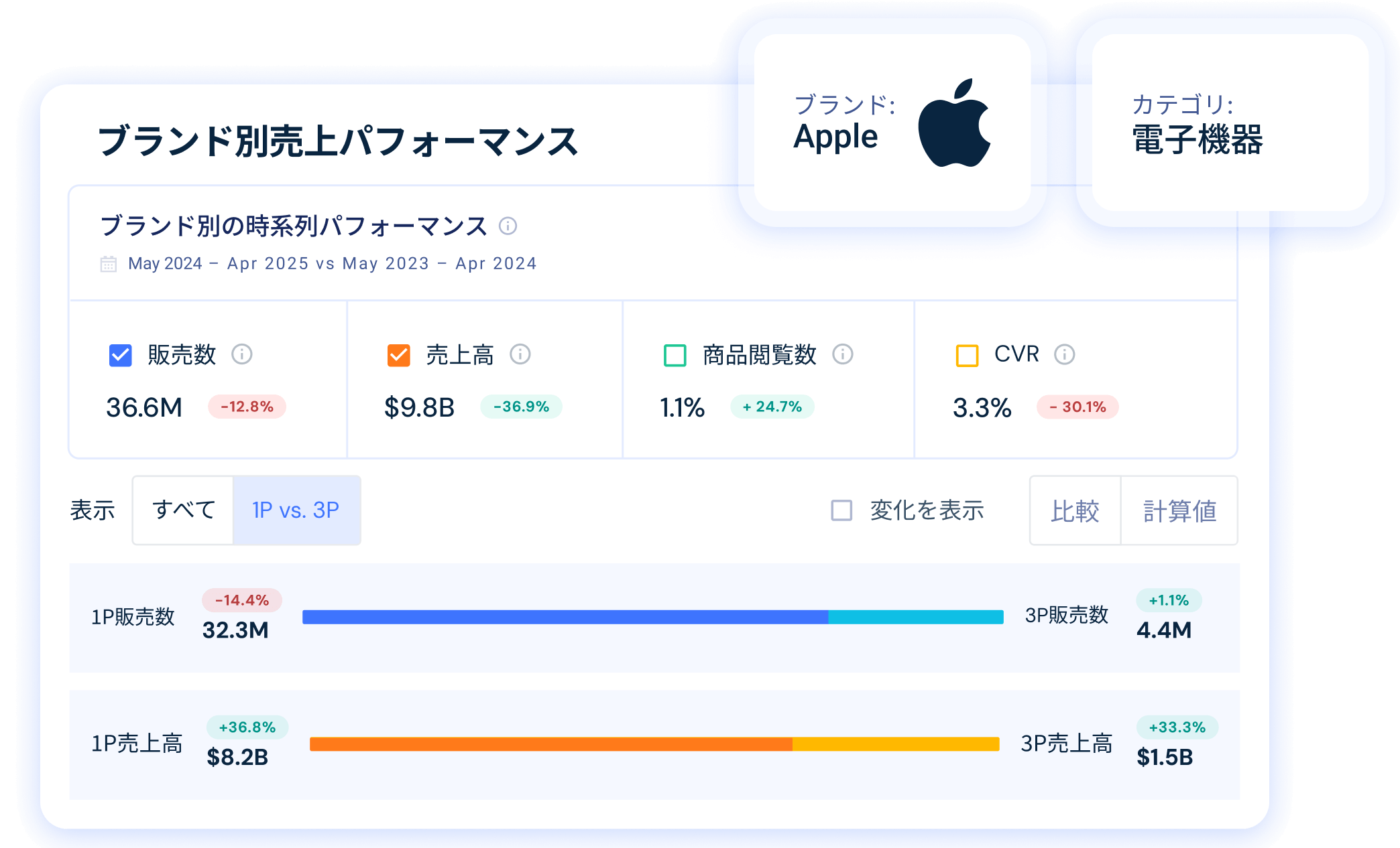 はい。ブランド、カテゴリー、商品群ごとに、競合他社との売上、収益、トラフィック、コンバージョンをベンチマークできます。