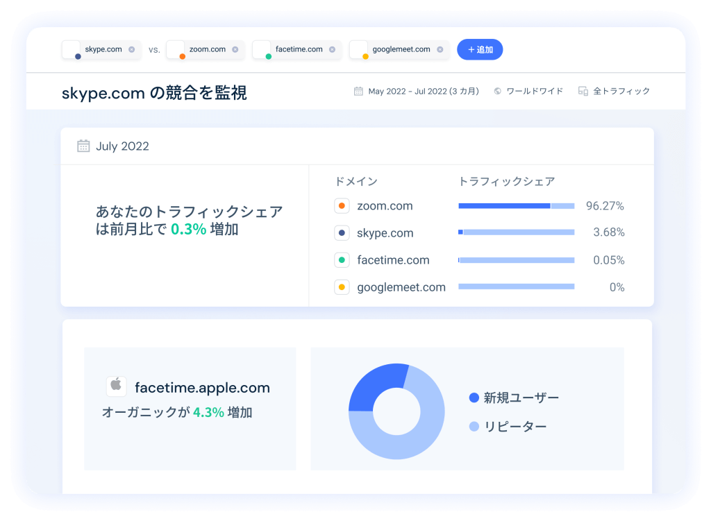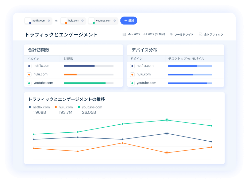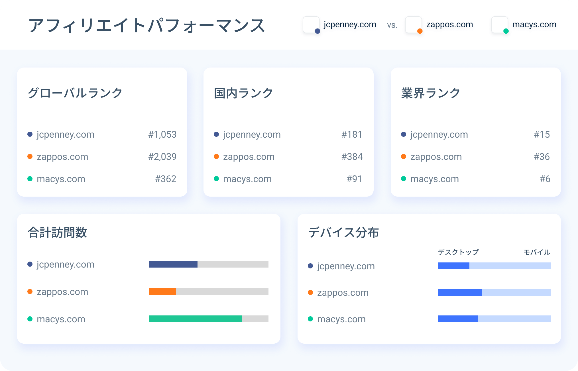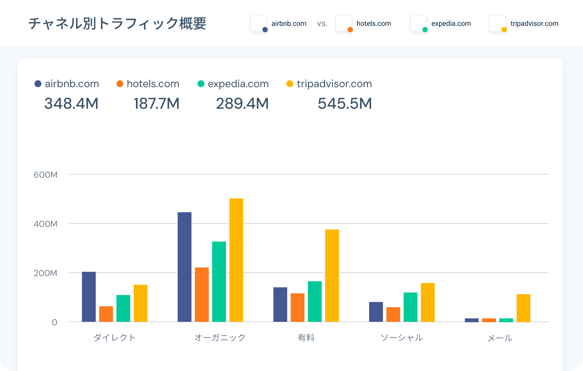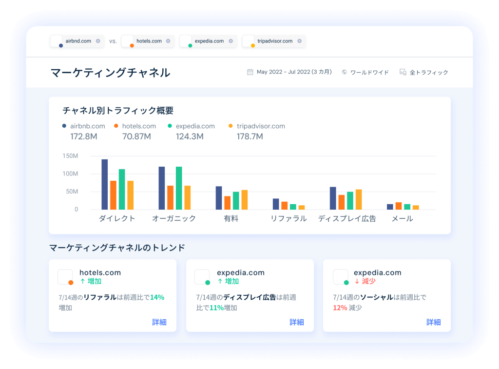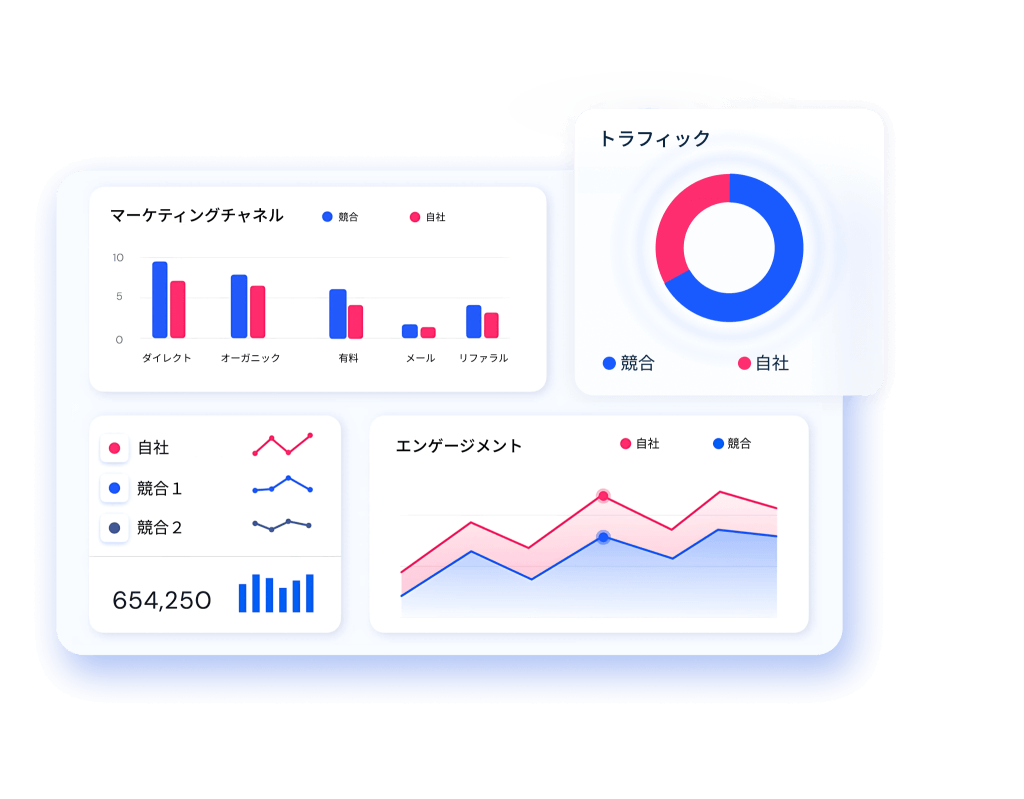 Similarwebの競合分析ツールなら、SEO対策や検索連動型広告、成果報酬型(アフィリエイト)広告、ディスプレイ型広告など、競合のオンライン施策をこのツール1つで明らかにできます。
