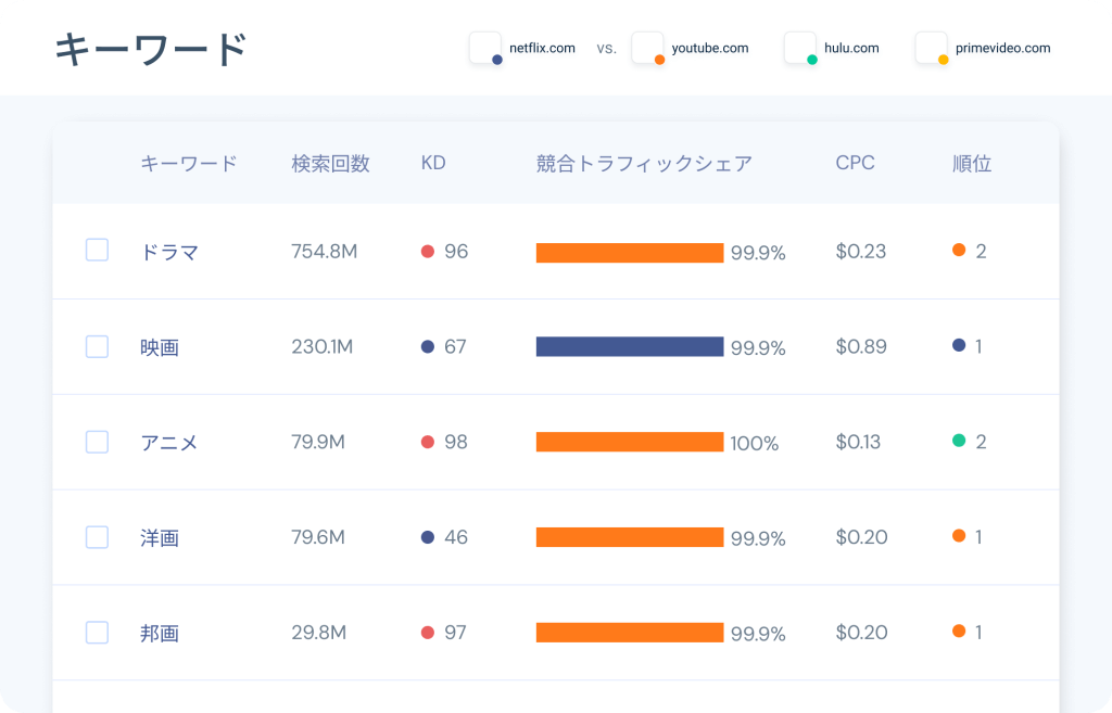 競合サイトのデータをまとめて即座に確認できる競合分析ツール。 アクセス数や流入数の多いページ、Google検索での表示状況など、ツール1つで把握できるため、時間をかけずに競合の動きをつかめます。 マーケティング戦略の見直しや新しい施策の立案に役立つ、便利な分析サービスです。