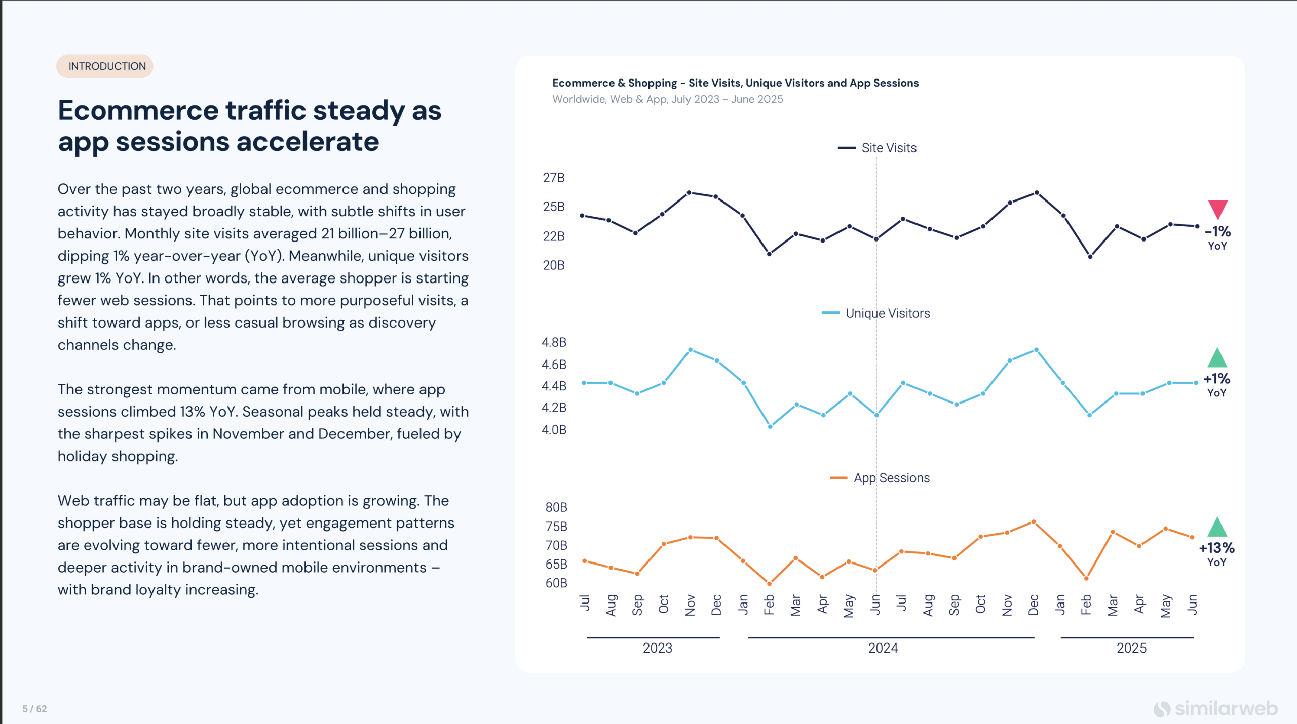 App sessions up 13% YoY while web visits stayed flat. Mobile is where engagement is growing.