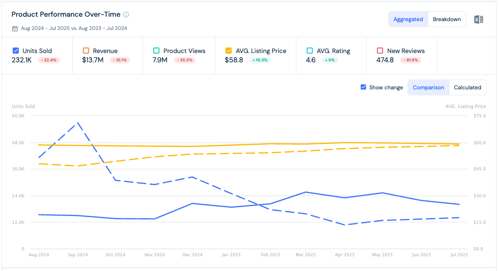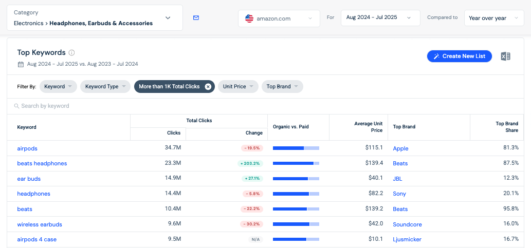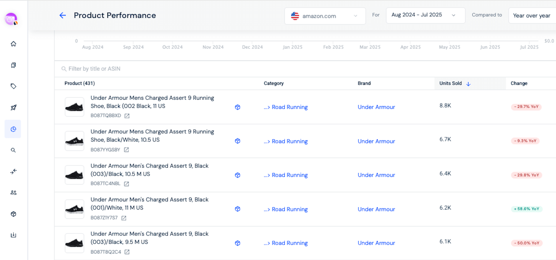 You can access SKU-level data on Amazon product listings, including price, availability, brand, rank, and performance. You’ll also get keyword-level shelf visibility and subcategory-level sales trends.
