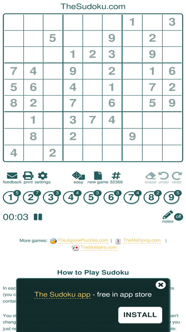 77%Enjoy an endless variety of free online Sudoku puzzles! Play your daily Sudoku, get printable puzzles, and explore all our helpful features, start playing now!