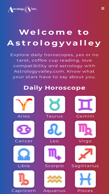 85%Explore daily horoscopes, yes or no tarot, coffee cup reading, love compatibility and astrology with Astrologyvalley.com. Know what your stars have to say about you.