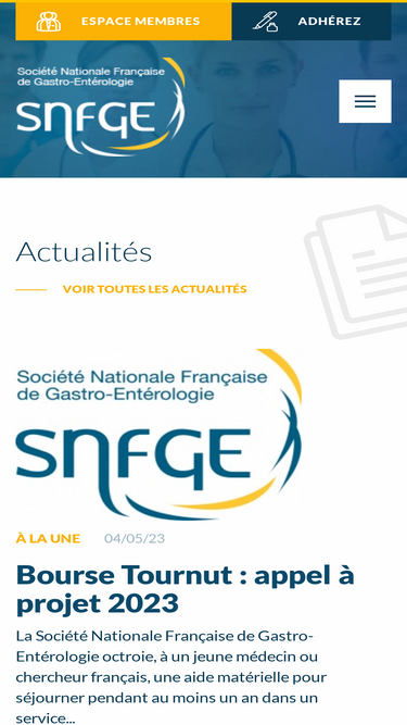 92%La Société Nationale Française de Gastro-Entérologie (SNFGE) est la société savante médicale des maladies et cancers de l’appareil digestif. , Fondée en 1947, la SNFGE est une association loi 1901 reconnue d’utilité publique.Elle compte près de 2 640 membres (médecins, chirurgiens, chercheurs, Dr Juniors/internes).Son Conseil d’administration est composé de 24 membres. , Son organisation , ⇒ LE CONSEIL D'ADMINISTRATION Les salariées :Charlotte Fafart-Touzard, directeur Stratégie & DéveloppementCorine Dahan, directeur administratifMelissa Cail, assistante , Ses missions , Améliorer les connaissances, la prise en charge et la prévention des maladies de l'appareil digestif y compris dans les domaines de la nutrition, de l’addictologie et de la cancérologie ; Organiser des actions de formation médicale continue, notamment en lien avec le développement professionnel continu (DPC), et des formations scientifiques en hépato-gastroentérologie et oncologie digestive pour les professionnels de santé ou toute catégorie de personnes intéressées ; Participer à l’évaluation des pratiques dans la discipline, notamment à l’évaluation des pratiques professionnelles et à l’accréditation pour les pratiques à risque ; Participer à toutes actions dont l’objectif est l’amélioration et l’optimisation de la prise en charge des malades ; Etablir ou participer à l’établissement de recommandations de prise en charge des malades dans tous les domaines concernés par la discipline ; Favoriser et développer la recherche médicale et scientifique en hépato-gastroentérologie et oncologie digestive, ainsi que dans toutes les disciplines médicales et paramédicales appliquées à l’hépato-gastroentérologie ; Favoriser les échanges entre les médecins français et étrangers intéressés par la discipline ; Défendre et promouvoir la discipline et sa lisibilité auprès des institutions, des tutelles, du corps de santé et du public. , Ses principales actions , Organisation des Journées Francophones d’Hépato-gast