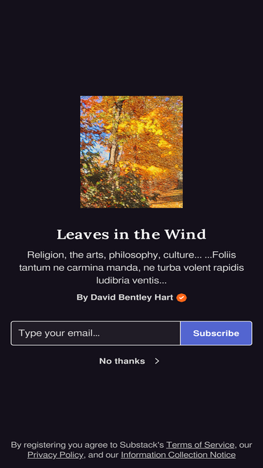 religion, the arts, philosophy, culture... ...foliis tantum ne carmina manda, ne turba volent rapidis ludibria ventis... click to read leaves in the wind, by david bentley hart, a substack publication.