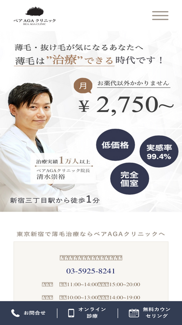 74%「ベアAGAクリニック新宿院」では、院長が厳選したAGA治療を“安価”でご提供。全ての患者様を院長が診察する、安心のプライベートクリニック。薄⽑に対するどんなお悩みでもお気軽にご相談ください。AGAクリニックおすすめ・人気ランキングでも紹介された、効果の高い治療を行います。