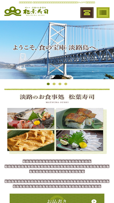 92%淡路島のグルメと言えば兵庫県南あわじ市にある松葉寿司です。淡路島の旬の食材ふぐ、はも、ウニ、鯛、あなごなどを使った寿司をご用意しています。宴会やご旅行に松葉寿司の和食や寿司をいかがでしょうか?是非、淡路島のグルメをご堪能ください。