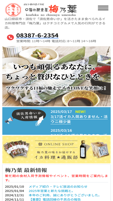 100%萩津和野で活イカ・活ウニ・磯料理を楽しむ店「口福の馳走屋 梅乃葉」の携帯(モバイル)ページです。梅乃葉のイカ料理をお得にできるモバイルクーポン「梅食うポン」の携帯登録もこちらで!