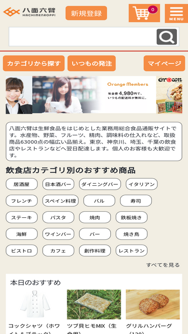 84%八面六臂は生鮮食品をはじめとした業務用総合食材通販サイトです。水産物、野菜、フルーツ、精肉、調味料の仕入れなど、取扱商品7,000点の幅広い品揃えをしており、東京、神奈川、埼玉、千葉の飲食店やレストランなどへ翌日配達します。個人のお客様も大歓迎です。