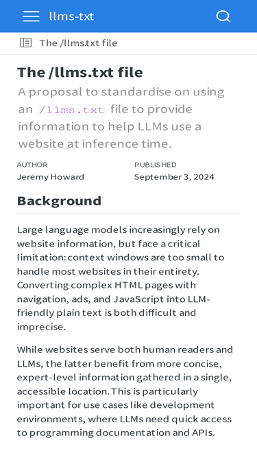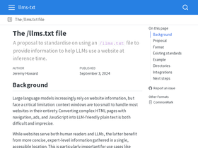 51%A proposal to standardise on using an /llms.txt file to provide information to help LLMs use a website at inference time.