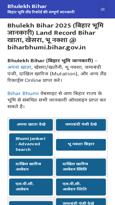 91%biharbhumijankari.info पर हम बिहार भूमि पोर्टल पर मौजूद सभी ऑनलाइन सेवाओं के बारे में जानकारी और डायरेक्ट लिंक प्रदान करते हैं.