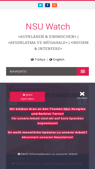 Liebe Spender*innen, aus organisatorischen Gründen ist „NSU-Watch – Aufklären & Einmischen“ ab dem 1. Januar 2026 beim Verein Büro für Text und Aktion e.V. aus Berlin angesiedelt. Auch der neue Verein ist als gemeinnützig anerkannt. Unser bisheriger Trägerverein apabiz e.V. bleibt weiter wichtiger Teil des NSU-Watch-Netzwerks. Spenden für NSU-Watch bitte nur noch auf unser neuesRead More