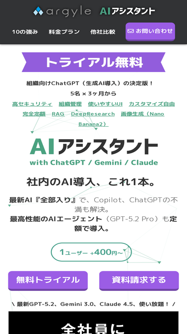 100%最新20種類以上の生成AIモデルが使える「AIアシスタント」で、ChatGPTを法人導入。直感的なタブ型UI、高度なセキュリティ、カスタマイズ性能で、組織業務の効率化をサポート。最少5名、3ヶ月契約からの完全定額プラン。企業法人、行政機関、自治体、教育機関の導入事例も多数。