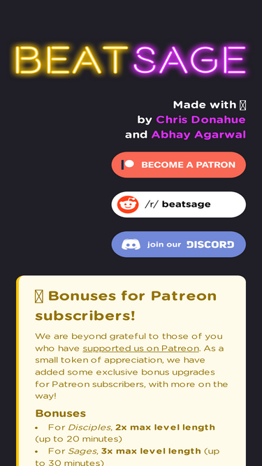 80%Beat Sage is an AI that creates free custom levels for Beat Saber. You can select a song from Youtube and our system will output a Beat Saber map that is matched with that song! Beat Sage is compatible with SteamVR, Oculus PC, and Oculus Quest versions of Beat Saber.