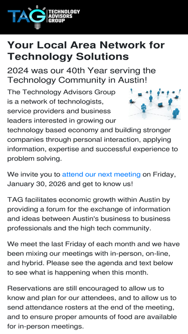 87%the technology advisors group in austin, texas is a network of service providers and business leaders interested in growing our technology based economy and building stronger companies through personal interaction, applying information, expertise and successful experience to problem solving.