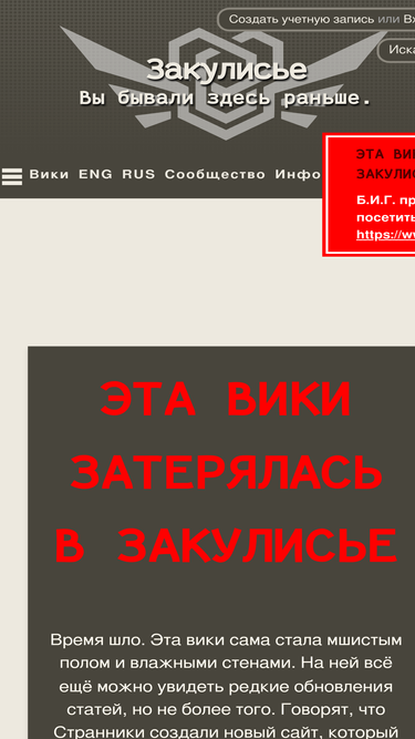Содержание Общие вопросы Сообщества по Закулисью Вопросы по вики Вопросы насчёт администрации Вопросы по лору Прочие вопросы Закулисье, самая первая картинка. Общие вопросы : Что это за сайт? : Вики Закулисья — сайт коллективного литературного творчества, сфокусированного на, собственно, Закулисье. Авторы пишут новые статьи про Уровни, Сущностей, Объекты. Есть также рассказы и друг...