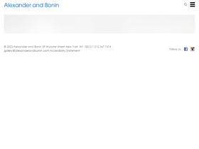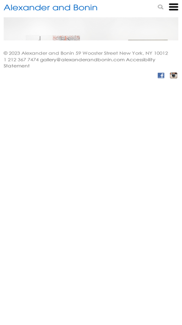 100%Alexander and Bonin was established in 1995 in New York City by Carolyn Alexander and Ted Bonin with the primary purpose of representing and supporting the work of emerging, mid-career, and established international contemporary artists. Since its inception, the gallery has worked closely with museums and public institutions around the world and has established a reputation for a rigorous and diverse programme. Since 1997, Alexander and Bonin was located at 132 10th Avenue in Chelsea before moving to 47 Walker Street in Tribeca in 2016. Alexander and Bonin is now located at 59 Wooster Street in SoHo.