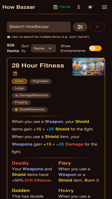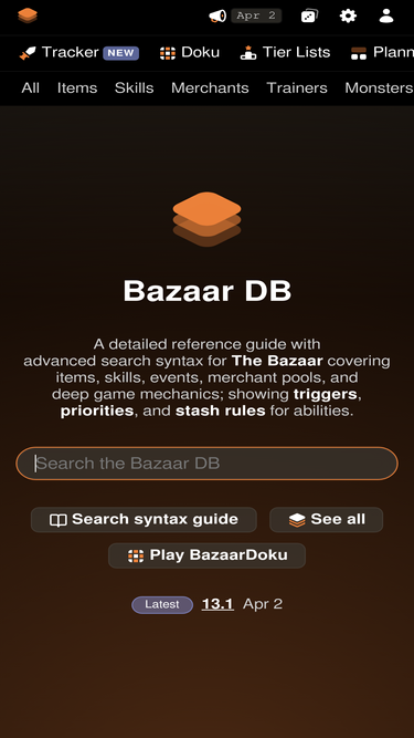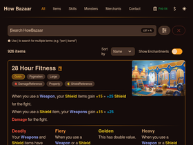 Updated to Version 2.5.0. A community-driven, unofficial knowledge center for all things The Bazaar. If you want to contribute, check out one of the item pages to see how our templates work, or join our Discord server! The Bazaar is a free-to-play Hero Builder developed by Tempo. Set in a vibrant, ever...