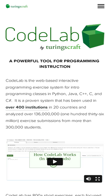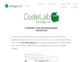 98%CodeLab is the web-based interactive programming exercise system for intro programming classes in Python, Java, C++, C, and C#. With 800+ short exercises, each focused on a particular programming idea or language construct. The student types in code and the system immediately judges its correctne