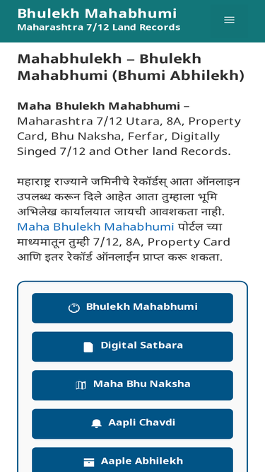 Maha Bhulekh Mahabhumi - Maharashtra 7/12 Utara, 8A, Property Card, Bhu Naksha, Ferfar, Digitally Singed 7/12 and Other land Records.
