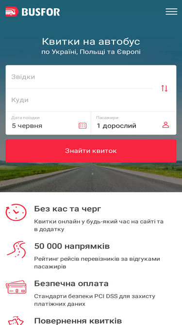 автобусні квитки для поїздок україною, європою та снд. великий вибір рейсів. безкоштовне бронювання та легка покупка. гарантія повернення коштів за квиток - busfor.ua